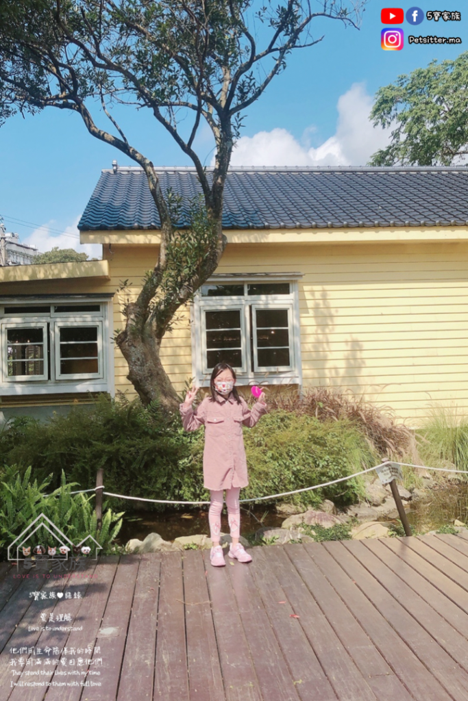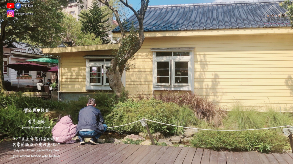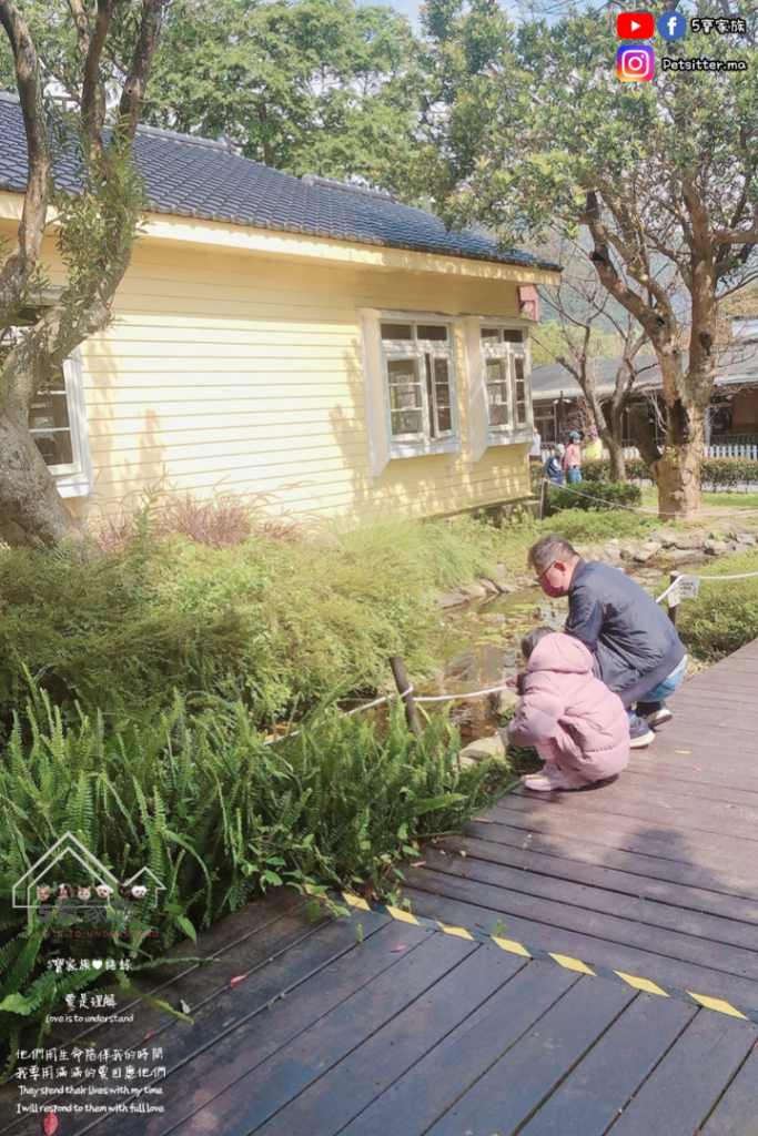 5寶姐姐很喜歡餐廳旁的小池塘,和阿拔蹲在這看很久⋯