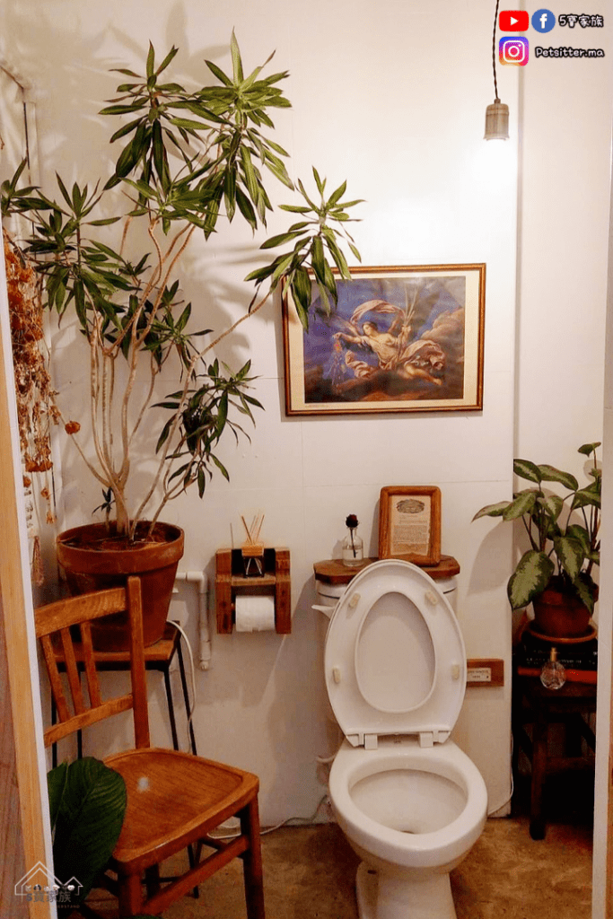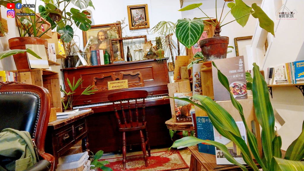 充滿著雜貨與復古並存的氛圍。老宅的特點:鐵窗、檯燈、復古沙發、木門穿插其間,和好多擺放著書籍的書櫃⋯