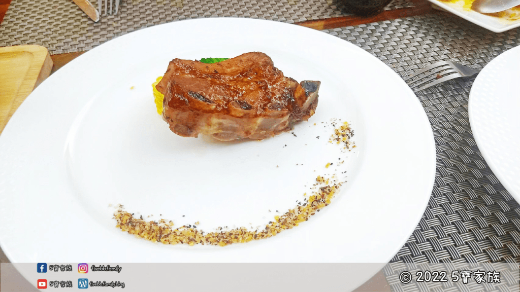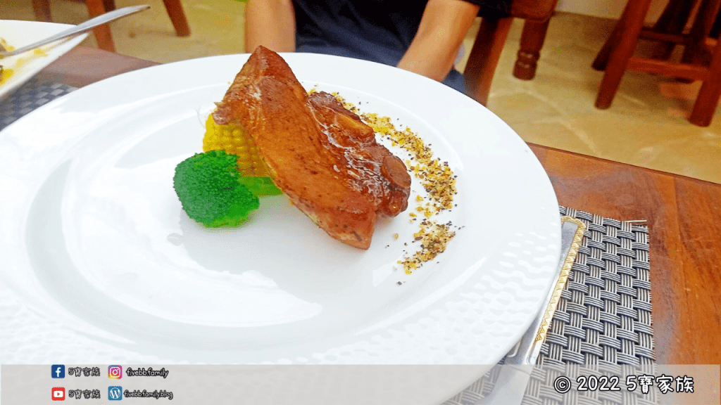 幸好,5寶阿目只有訂2人份。後面一道是海鮮濃湯,因為這道有蝦。所以只能交給2個小朋友品嚐。他們喝完這充滿濃郁異國風的海鮮濃湯後,已經呈現血糖值直衝腦部狀態。感覺到他們很想回房間去躺著看電視休息了。最後一道主菜,端上桌後⋯怎麼瞬間兩個小朋友像是恢復戰鬥值般繼續享用著豬排料理。