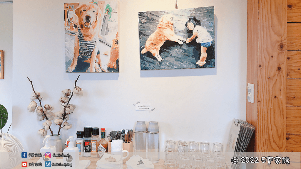 在我們座位旁,擺放了可以自行取用調味料及水杯等自取檯。而最讓人注目的就是牆面上的那兩幅畫作,這應該是所有擁有孩子及毛小孩的家庭都最愛的畫面吧!