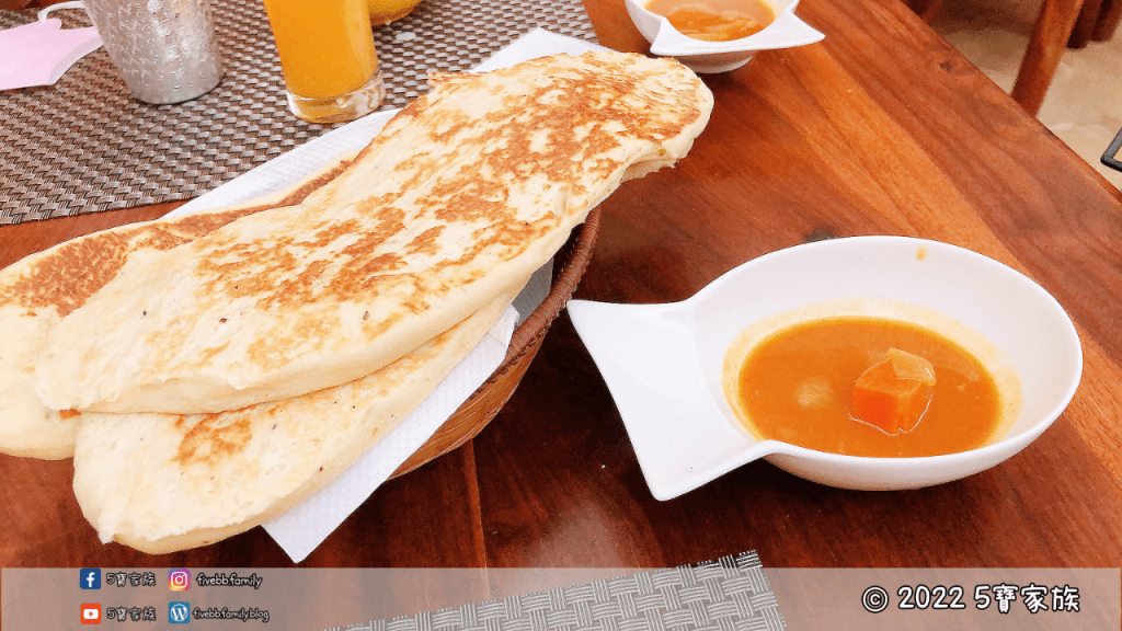 旁邊的咖喱是可以拿來蘸烤餅吃的,不過有點辣度!小朋友可能無法接受,但很合5寶阿目啦!