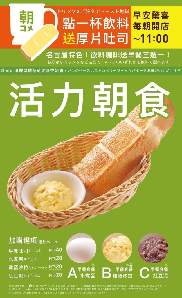 最受台灣人喜歡的就是名古屋朝食文化「點飲料附贈早餐」,每天早上11點前只要點用飲料,就會加贈吐司,有水煮蛋配烤吐司、雞蛋沙拉配烤吐司、紅豆泥配烤吐司3種選擇,飲品則需要再單點,咖啡售價約110~170元不等。