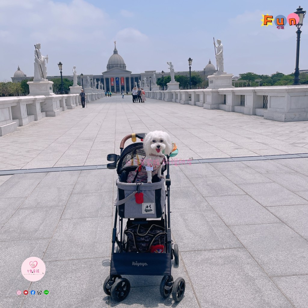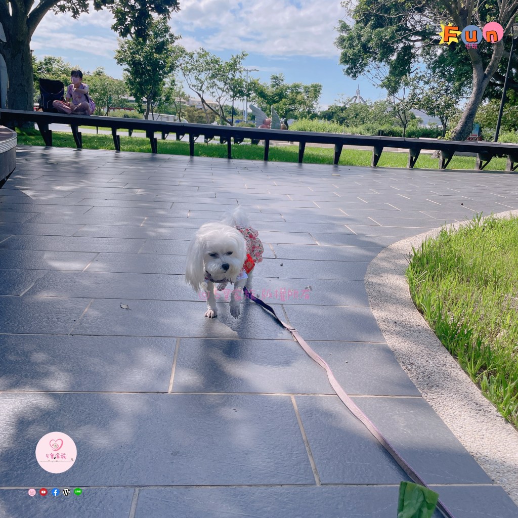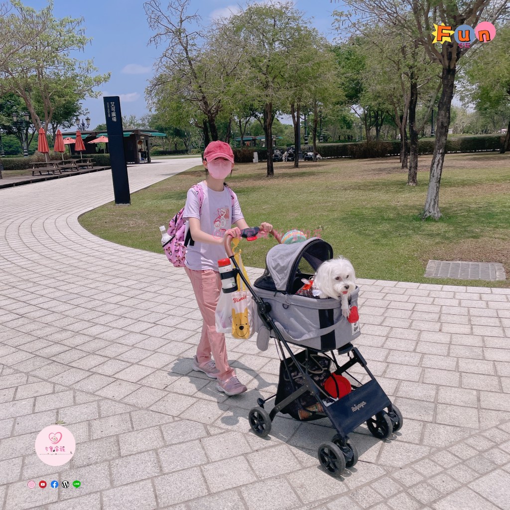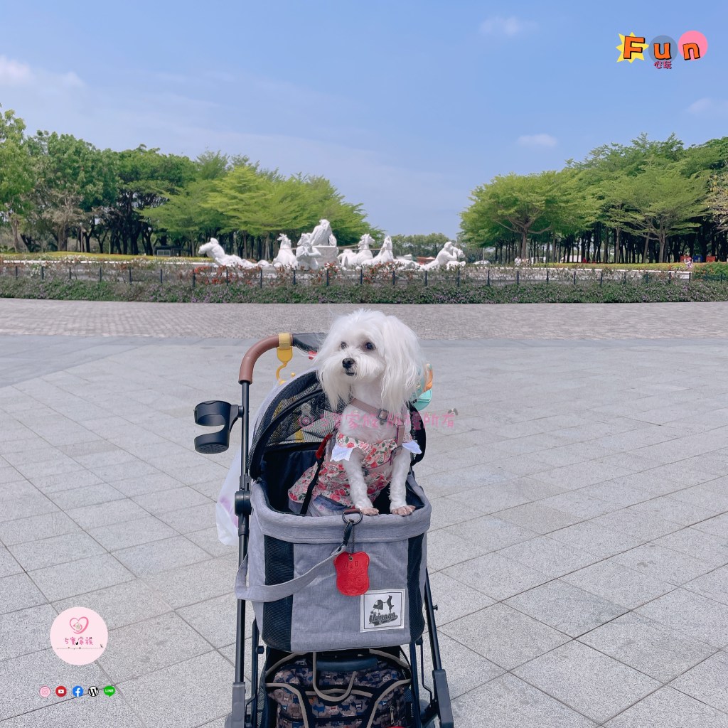 散步完,就要進入服務區的商店區域。通常我們還是習慣讓寶雅回自己的寵物袋(或是寵物推車)等待。