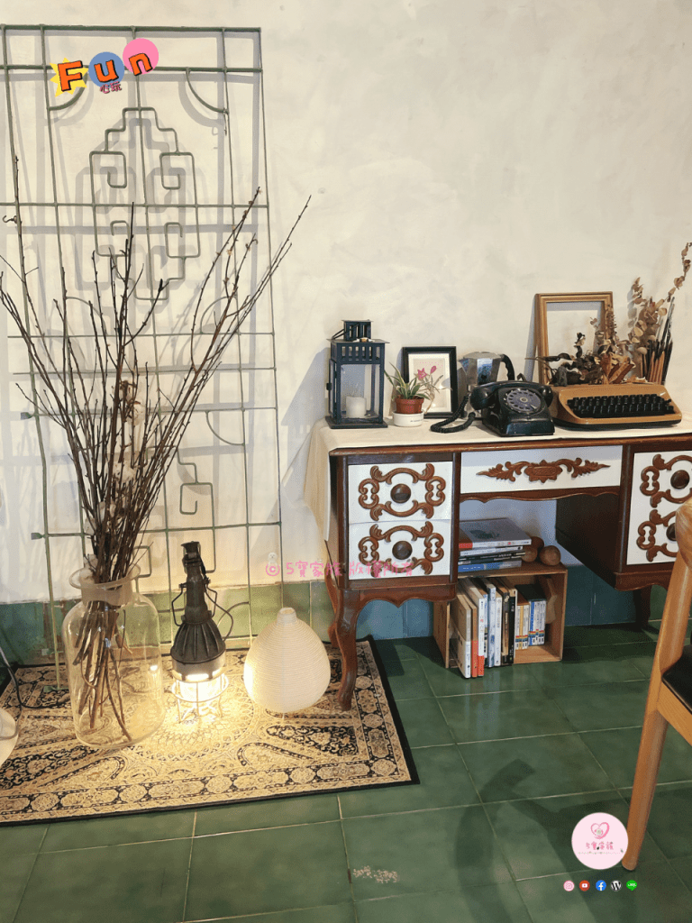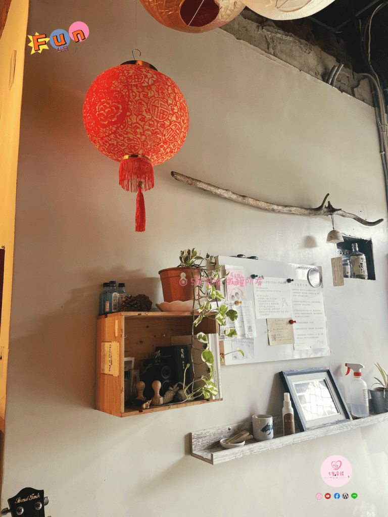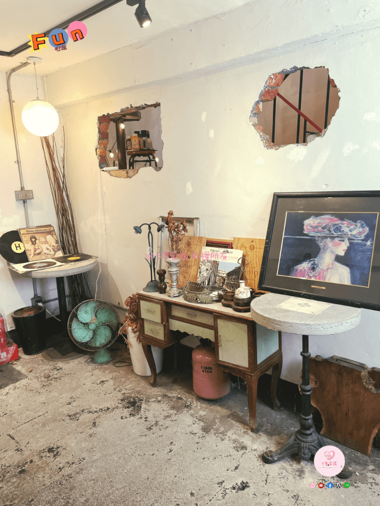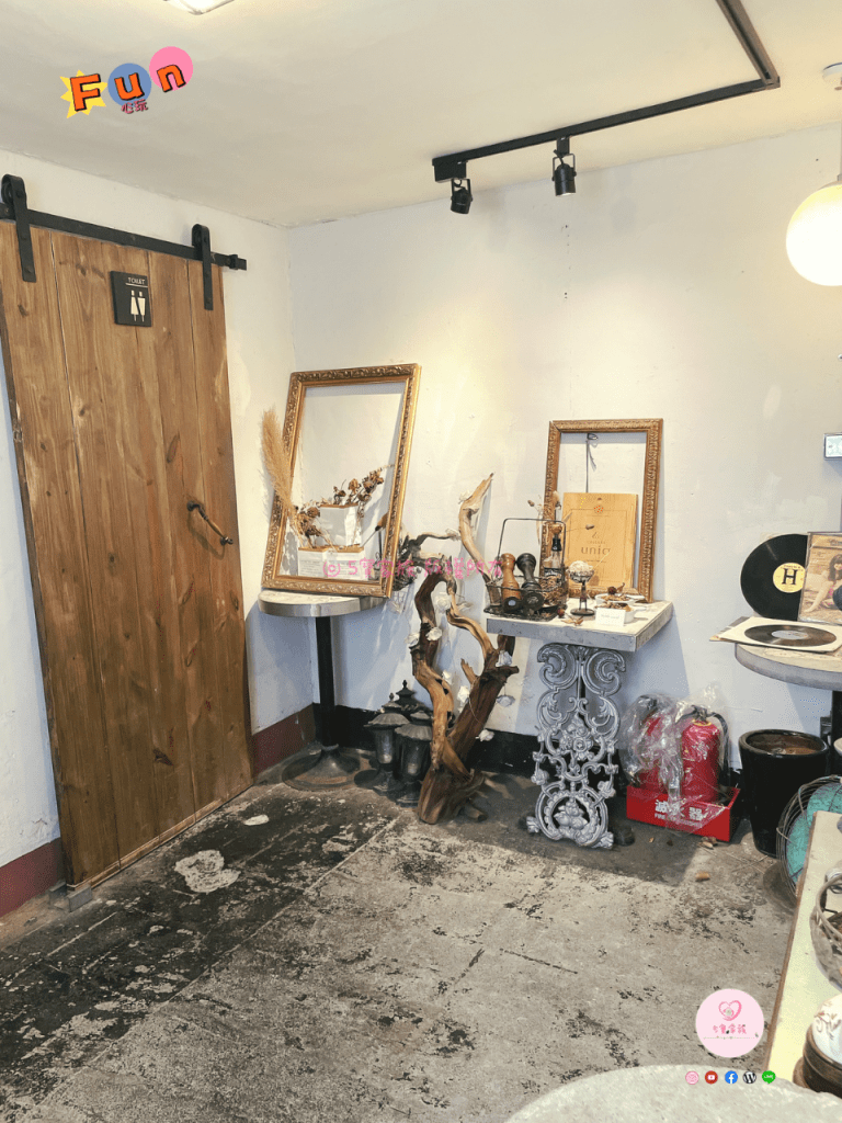 店內燈光較為溫暖、昏黃且各處可見復古的老物件點綴。
