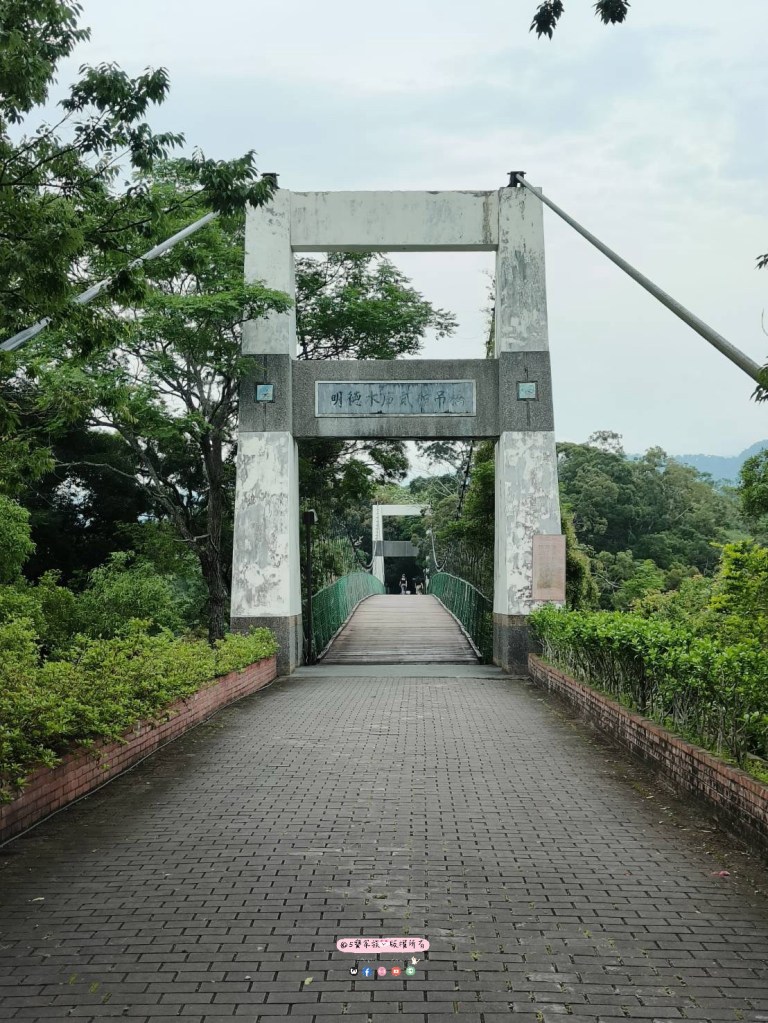 「日新島」位於明德水庫裡頭,對外僅有東西兩端兩座吊橋連接。