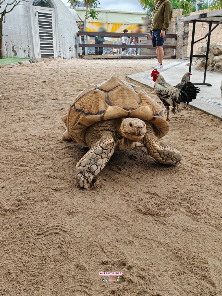 接著進入水豚和巨大蘇卡達象龜、梵天雞的區域,他們一樣好熱情!