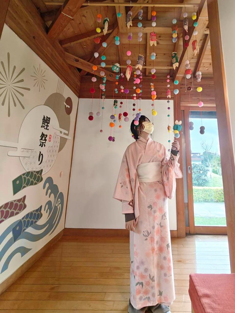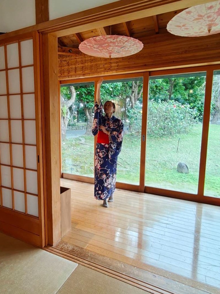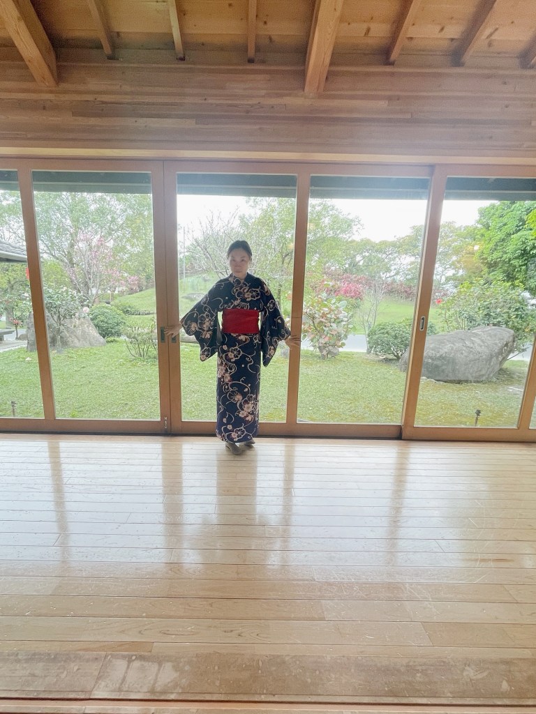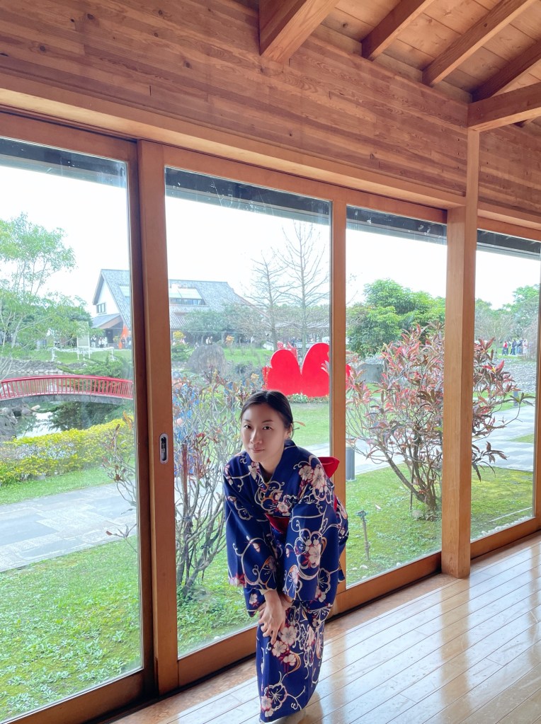 著裝完成後,我們就在館內拍照留念。其實是可以穿著浴衣到園區走動的,只是我們已經有點累了。就選擇館內留影。